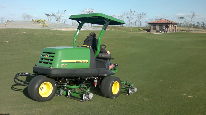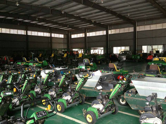 為打造頂級錦標賽事球場,從設計建造至今,覽海國際高爾夫俱樂部配備了綠友提供的草坪養護設備,一應俱全。高端上檔次的配置,為日后草坪的養護提供了堅強的保障,其中美國迪爾公司的8000E混合動力坐騎式五聯球道剪草機就成了其中的一大“功臣”。18英寸QA5刀組,兼備先進的油電混合技術,起早摸黑,征服了連綿起伏的球道,贏得了俱樂部草坪總監及其團隊的一致肯定。馳騁美巡,盼其再續輝煌征程。