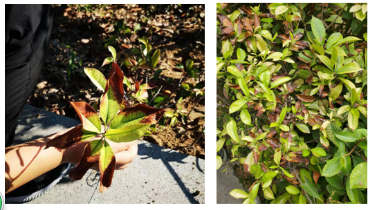 北方地區(qū)日照強(qiáng)度大,空氣濕度相對(duì)較較低,日灼現(xiàn)象十分明顯,紅葉石楠葉片邊緣受高溫影響大量失水導(dǎo)致葉片皺縮卷邊,開始枯黃,嚴(yán)重影響景觀效果。