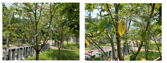 除此之外,筆者觀察到,長三角地區(qū)許多早櫻在受到高溫脅迫,出現(xiàn)樹勢(shì)衰弱、葉片枯黃的情況,各種病菌侵入,嚴(yán)重的出現(xiàn)了葉片穿孔。