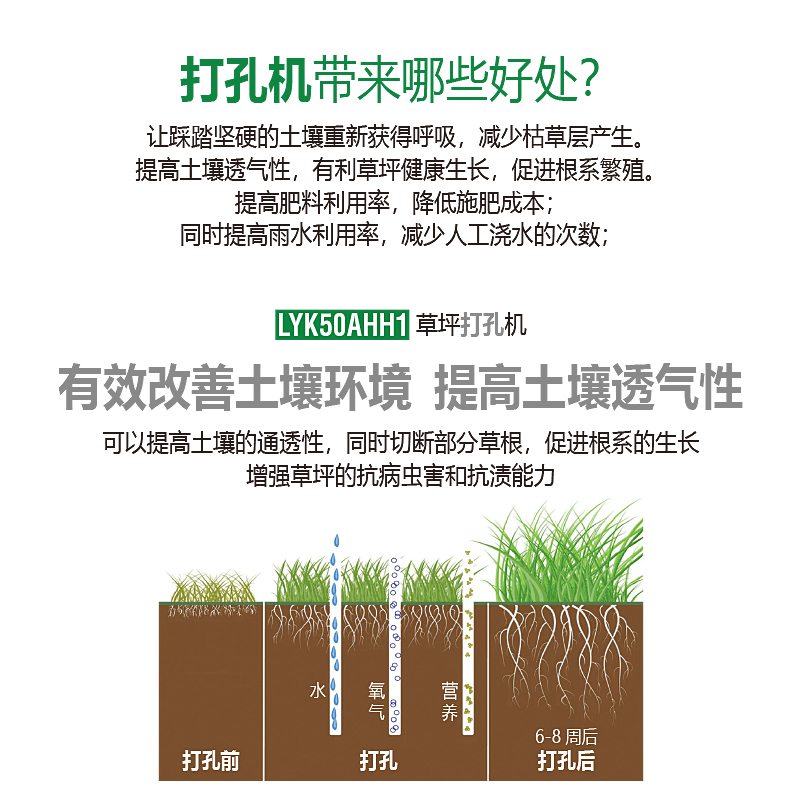 打孔可以切斷部分草根,促進根系的生長,增強草坪的抗病蟲害和抗漬能力。