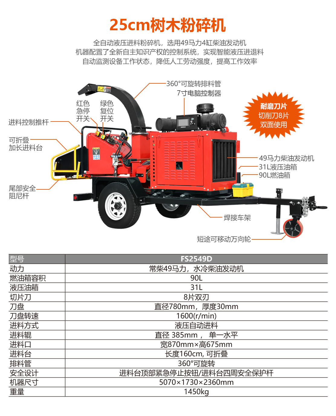 25cm全自動液壓進料粉碎機,選用49馬力環(huán)保柴油發(fā)動機。